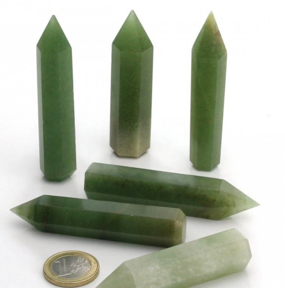 Esta punta de Aventurina Verde ha sido tallada de forma artesanal en la figura de un lápiz con 6 lados.